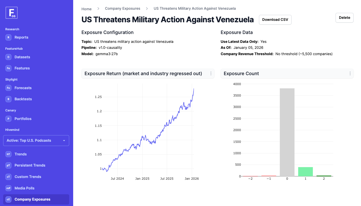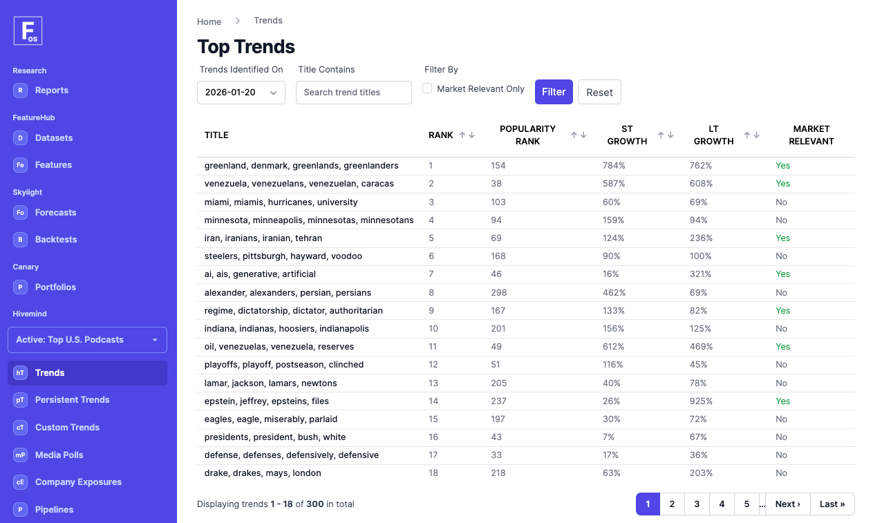 Hivemind is our trend and exposure engine. It takes messy, unstructured information (filings, podcasts, any text/financial data - even your own proprietary inputs) and turns it into clean, point-in-time exposures/factors. And because Hivemind is built to track narratives, it also continuously surfaces and ranks market-relevant trends, both daily...