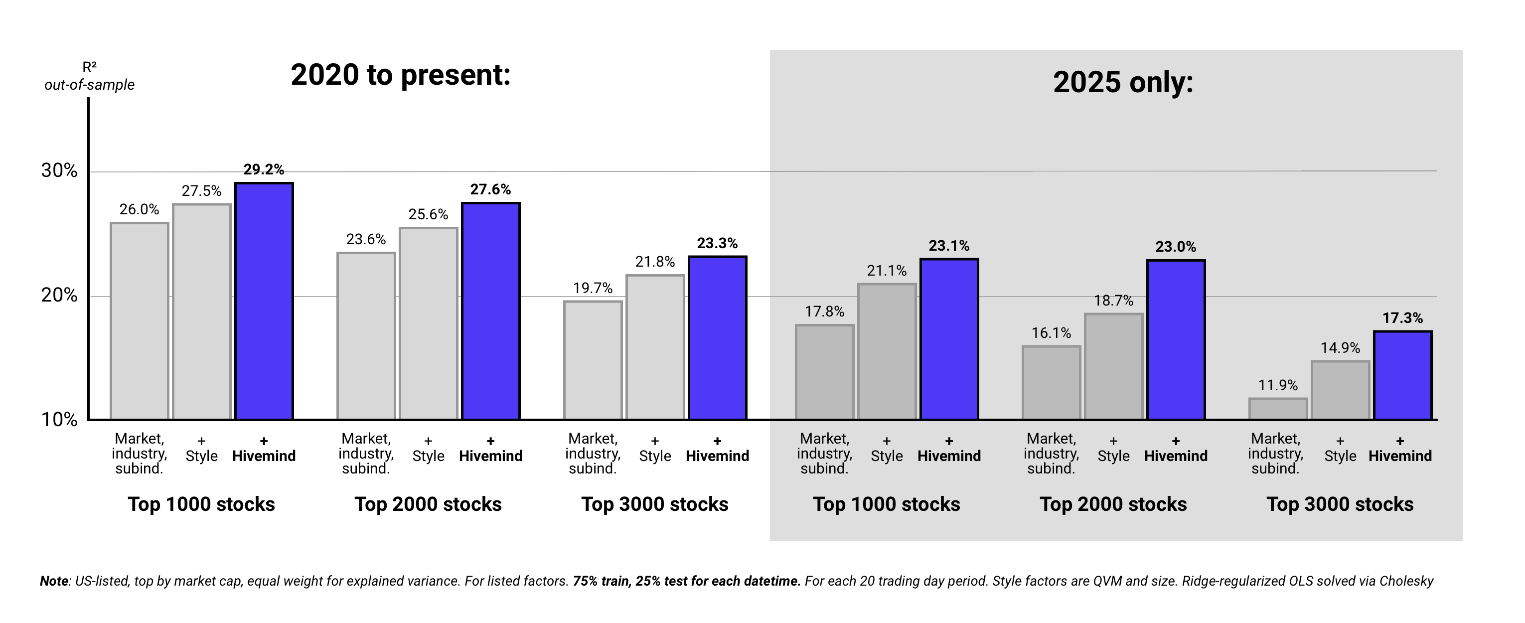 As per above, Hivemind’s macro and subindustry factors incrementally improved out-of-sample explained variance meaningfully; they identified systematic risk that conventional factors missed.